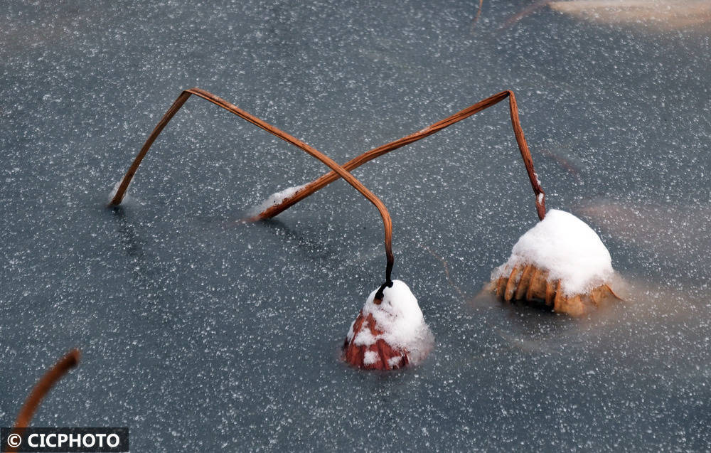 ↑2025年11月27日在辽宁省沈阳市北陵公园拍摄的荷塘雪景。CICPHOTO/黄金崑 摄
