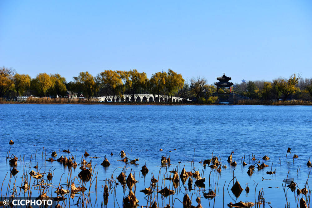 ↑2025年11月18日在北京颐和园拍摄的残荷。CICPHOTO/樊甲山 摄