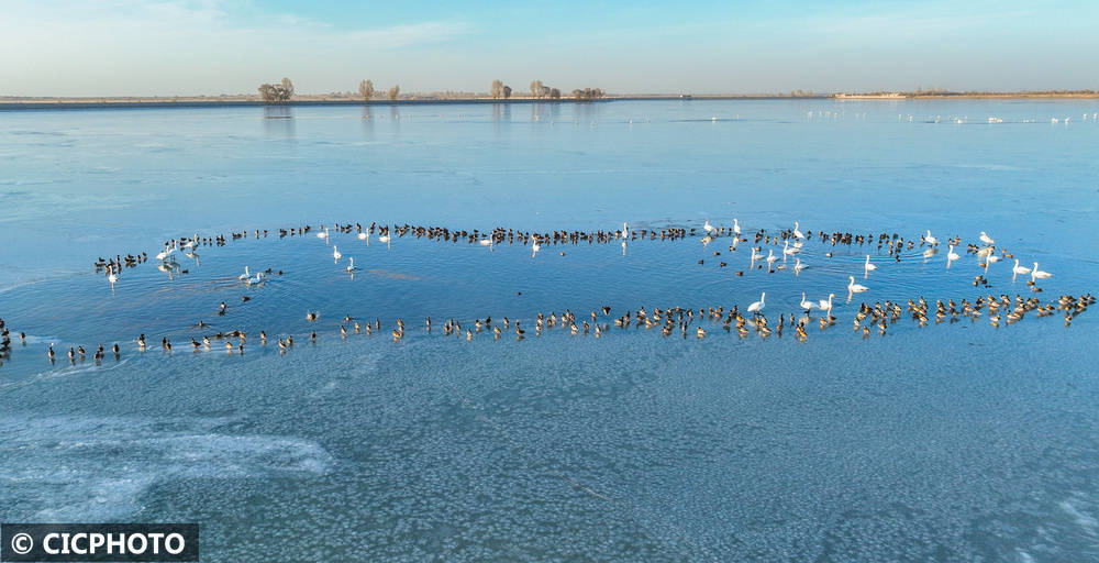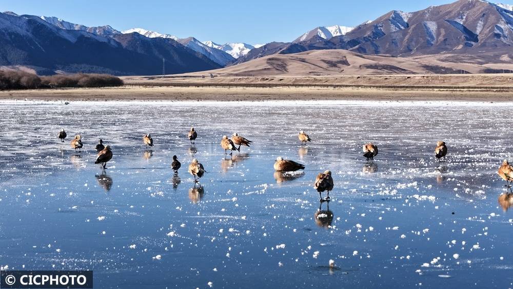 ↑2025年11月18日,赤麻鸭在甘肃省张掖市山丹县山丹马场鸾鸟湖湿地结冰的水面上栖息。CICPHOTO/王超 摄
