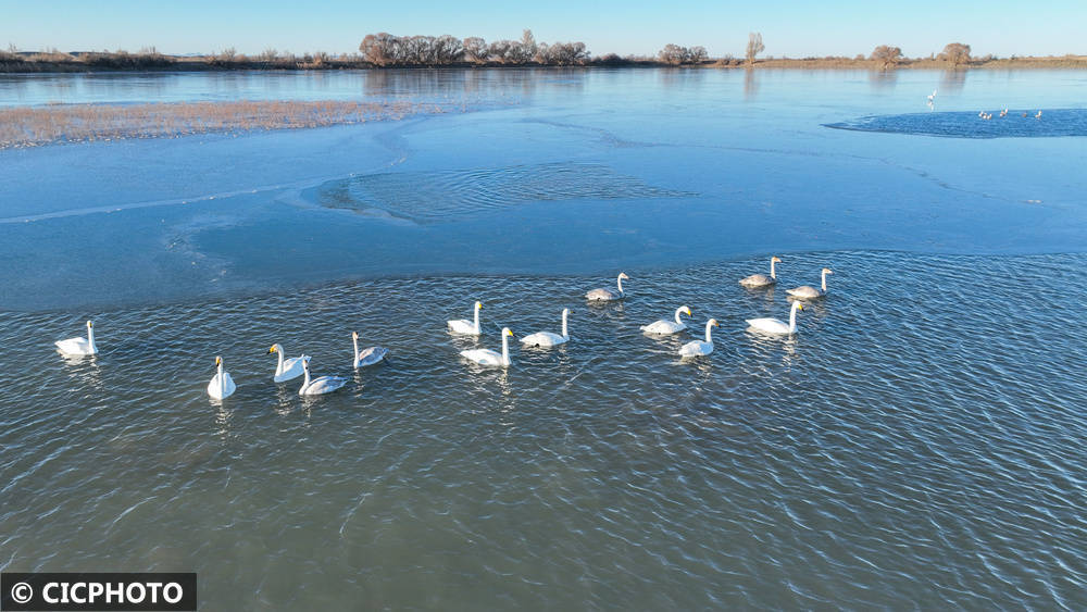 ↑2025年11月17日,天鹅在甘肃省酒泉市金塔县黑河湿地栖息。(无人机照片)CICPHOTO/曹红祖 摄